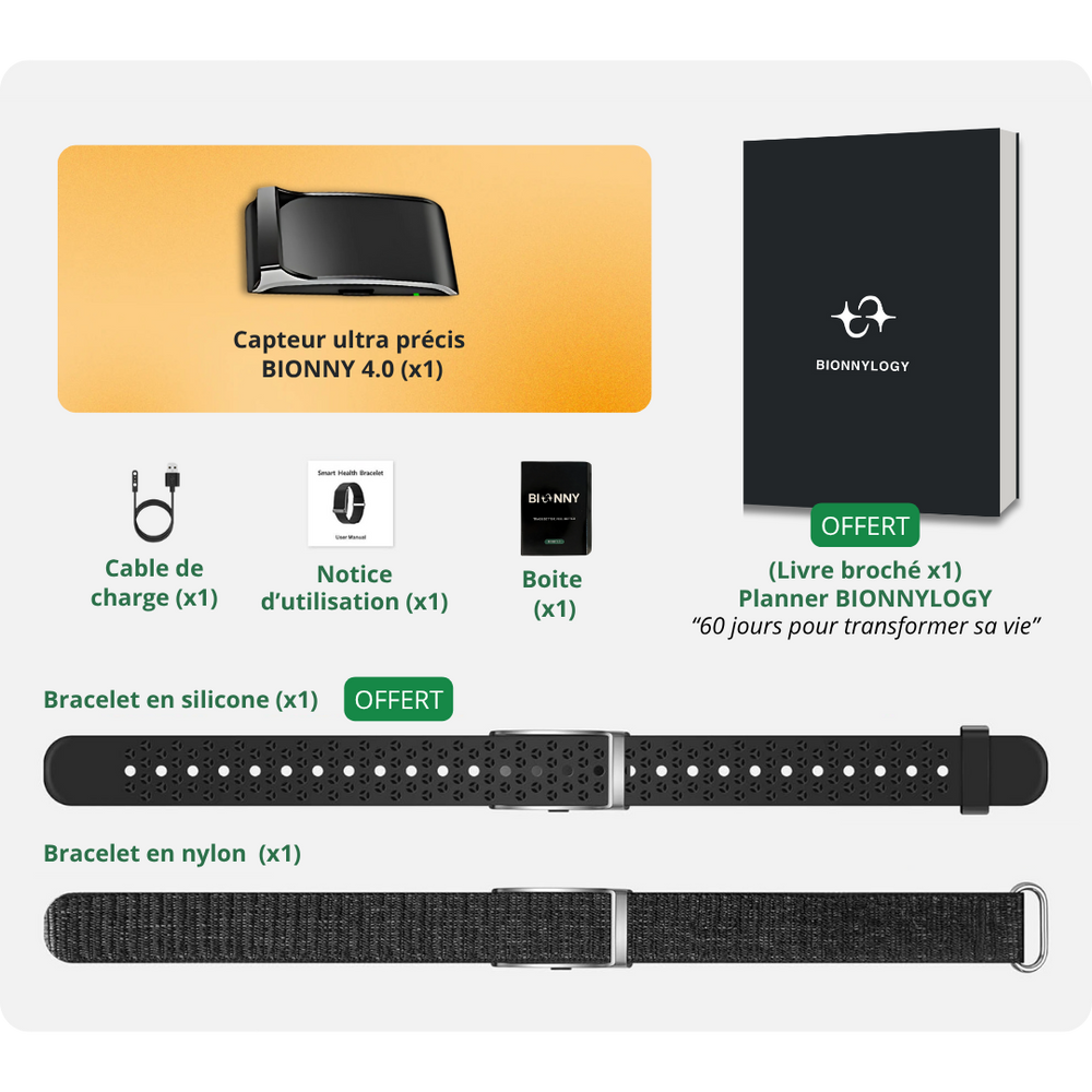 Vous recevrez un capteur BIONNY 4.0, un bracelet SuperTex, un chargeur, ainsi qu’un accès complet à l’application sans abonnement.